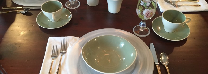 This beautiful tablescape comes to us from our guest contributor Pam Jones. The dishware is Harkleroad as seen on the 1960’s TV series, Gidget. I love the soft green and ivory colors!