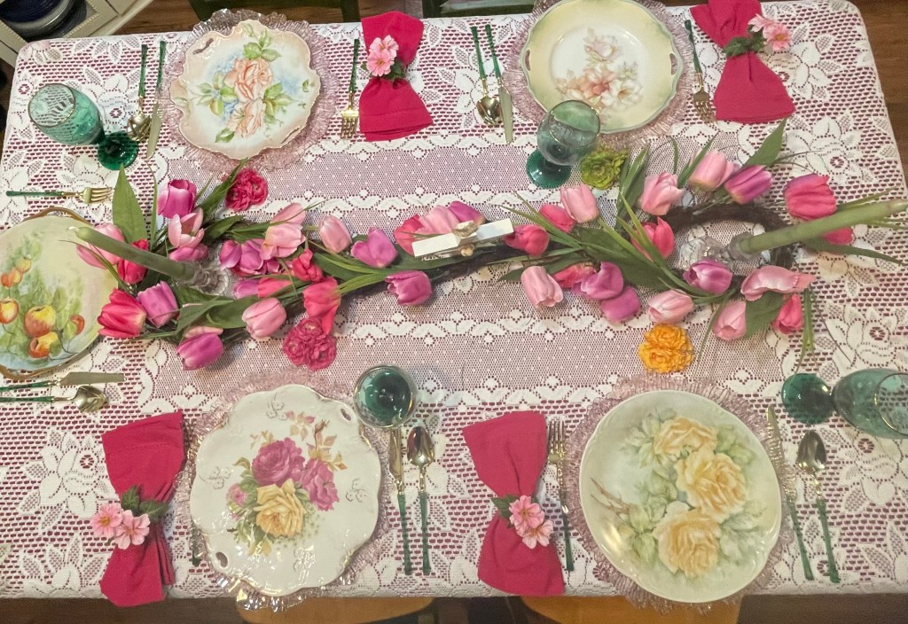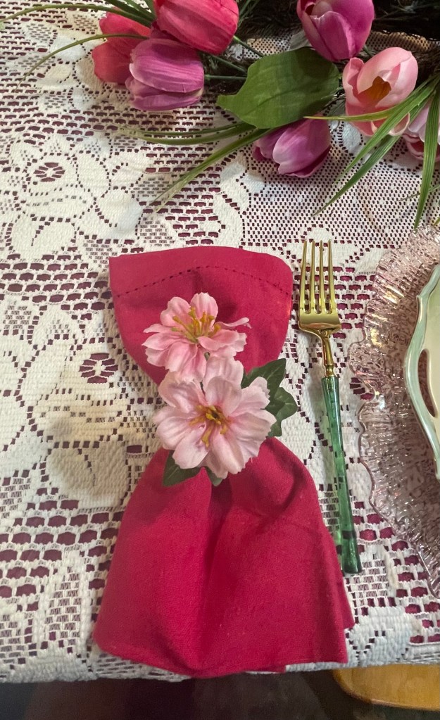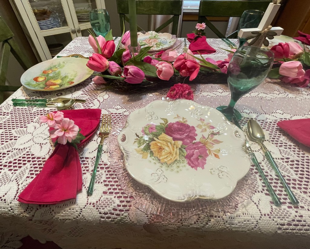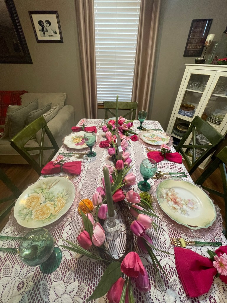 Pinks, Greens and Yellows represent the coming Springtime that happens after Easter. (Only 5 of us this year so we left the end for dishes and dessert.