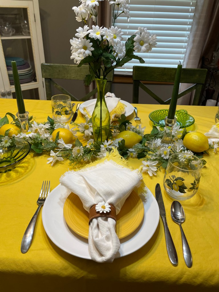 This place setting with daisy napkin ring holders was easy to make. The daisy is a sticker which comes easily off and on the napkin ring holder. The napkins were a deal with the white ones being $.75 each and the yellow ones being $1.75 each! The lemon glasses fit perfectly with the theme and the yellow and white plates kept everything light and bright!