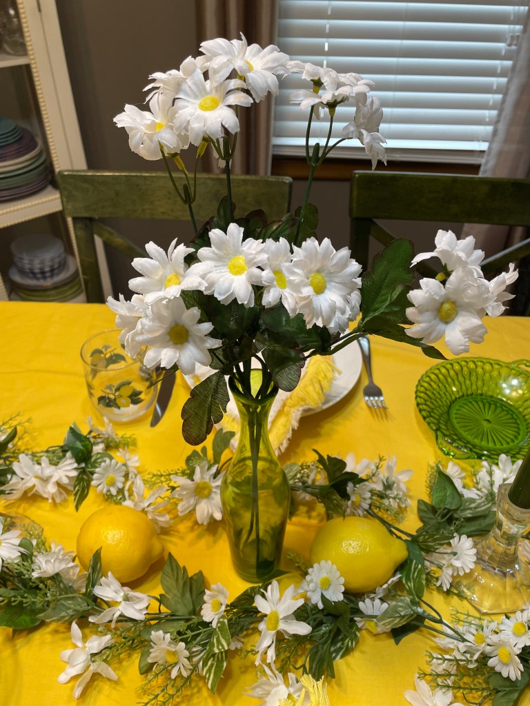 The centerpiece is made up of mini-daisies in an antique uranium glass bottle and a chain of white daisies with lemons in between. I love how bright and airy this feels!