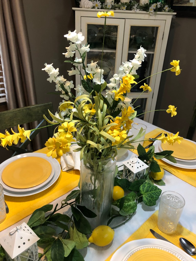 This lemon tablescape is a great summer look! I have been wanting to do a lemon tablescape for months! It was a cloudy day and so this made the inside looked so bright and cheery!