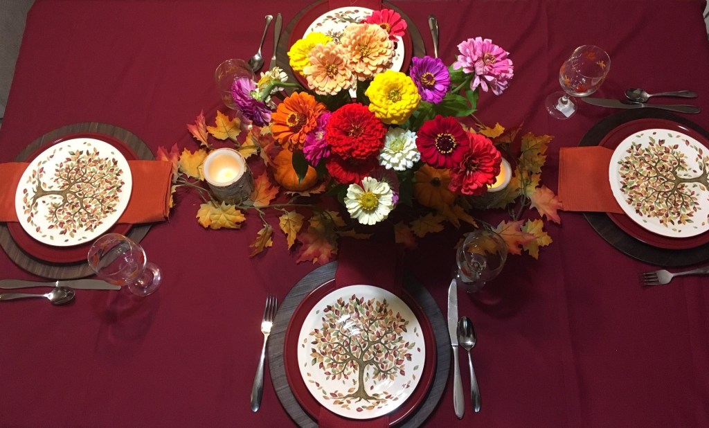 This view of the table from the other end shows a clearer view of the candy dishes with M&M’s. The napkin rings are actually shower curtain rings upcycled to napkin rings! The taper candles have a little sheen to them which add an elegance to the table.