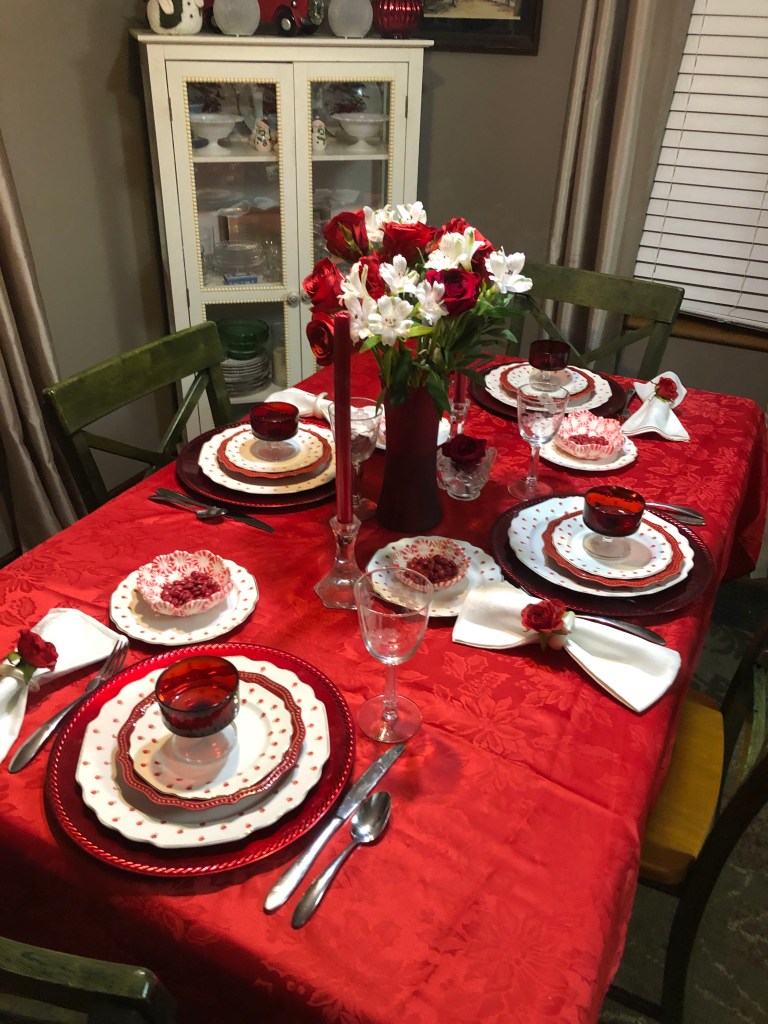 This Valentine’s tablescape was a combination of old and new. It has my mother’s water glasses, my grandmother’s dishes, and some antique Ruby dessert cups!